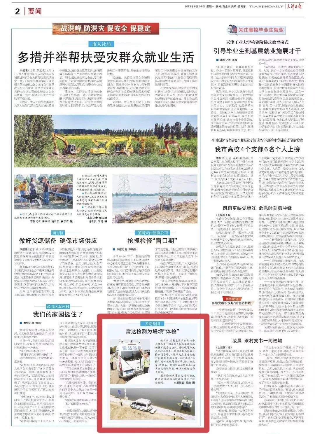 近日,天勘集團(tuán)發(fā)揮專業(yè)技術(shù)優(yōu)勢,積極服務(wù)防洪應(yīng)急搶險(xiǎn)工作,獲得較好的社會反響。8月14日,天津日報(bào)第二版刊發(fā)了《天勘集團(tuán)雷達(dá)檢測為堤壩“體檢”》一文,報(bào)道了天勘集團(tuán)防洪搶險(xiǎn)勘測技術(shù)服務(wù)突擊隊(duì)開展現(xiàn)場檢測工作情況。